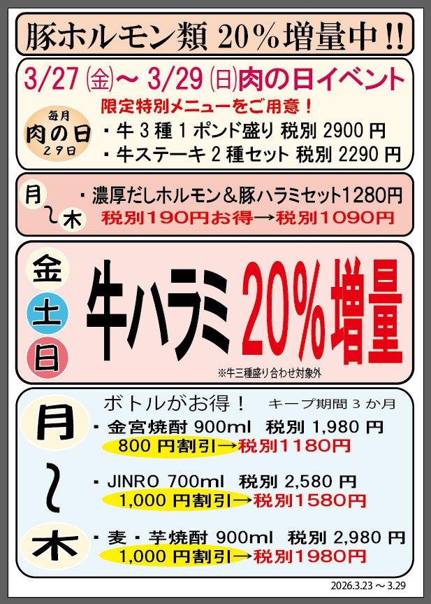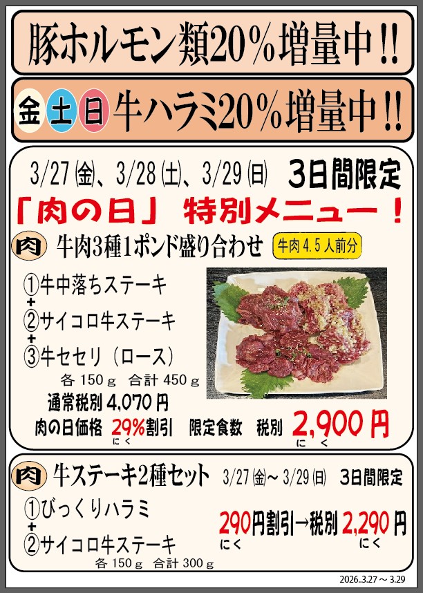 ⭐️3/27(金)〜3/29(日) 今月も「肉の日」特別メニューやります!