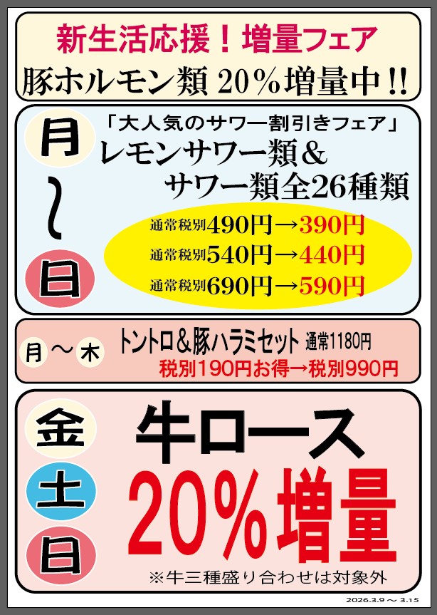 お知らせ⭐️3/9(月)〜3/15(日) レモンサワー10種&サワー16種 割引きフェア!